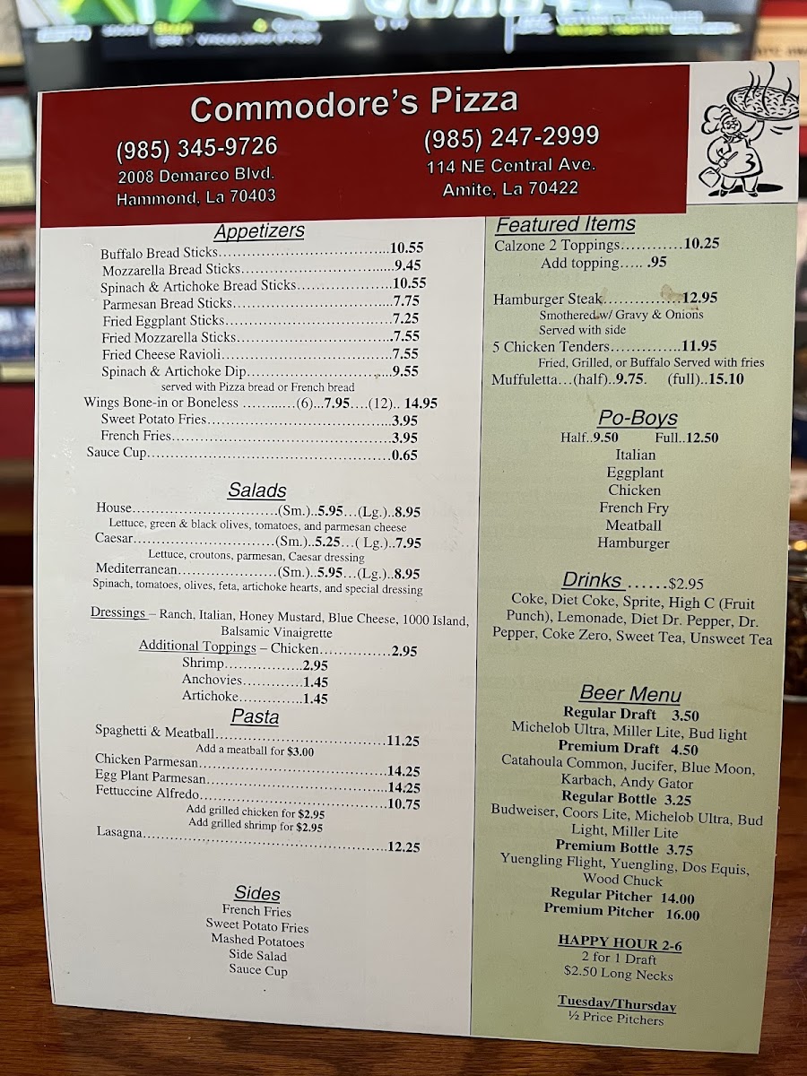 Introducing the mouthwatering menu at Commodore's Pizza, nestled in Hammond, LA, where comfort food meets a warm atmosphere. Their offerings go beyond just pizza, boasting a variety of fresh salads like the Mediterranean Spinach, accompanied by olives and feta, perfect as a refreshing start.