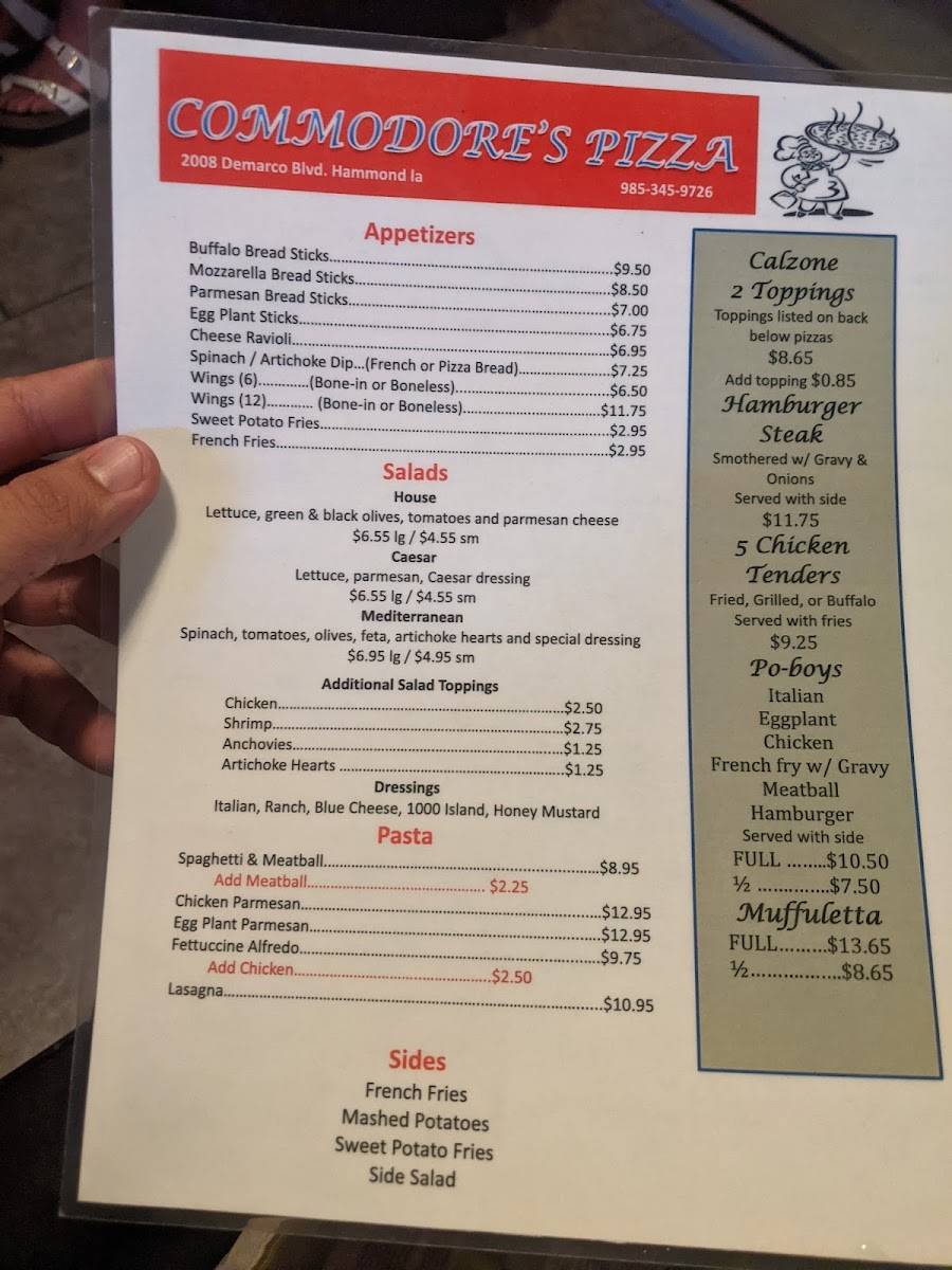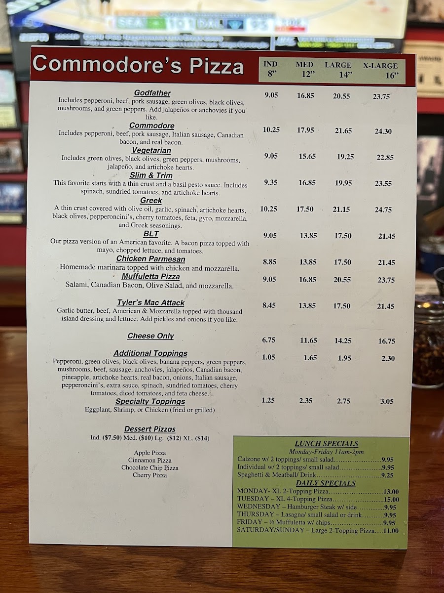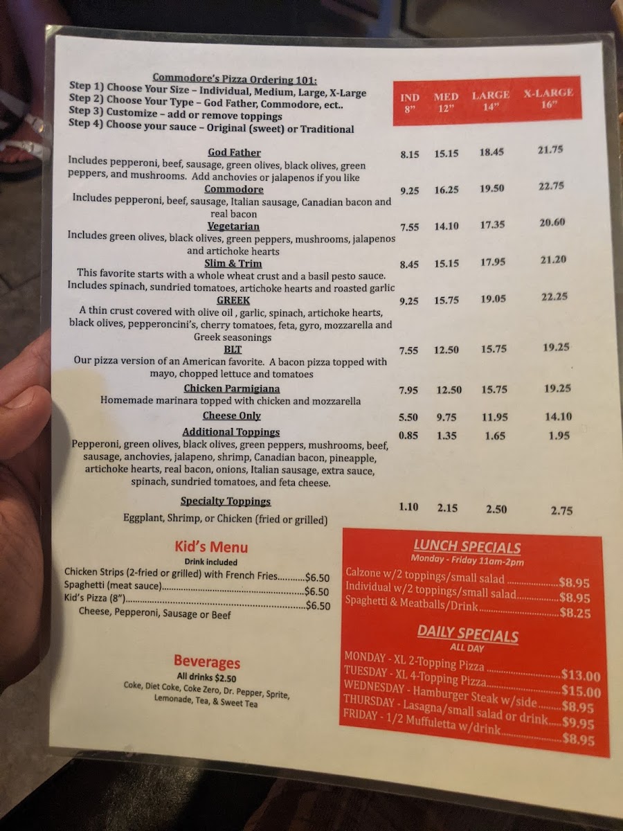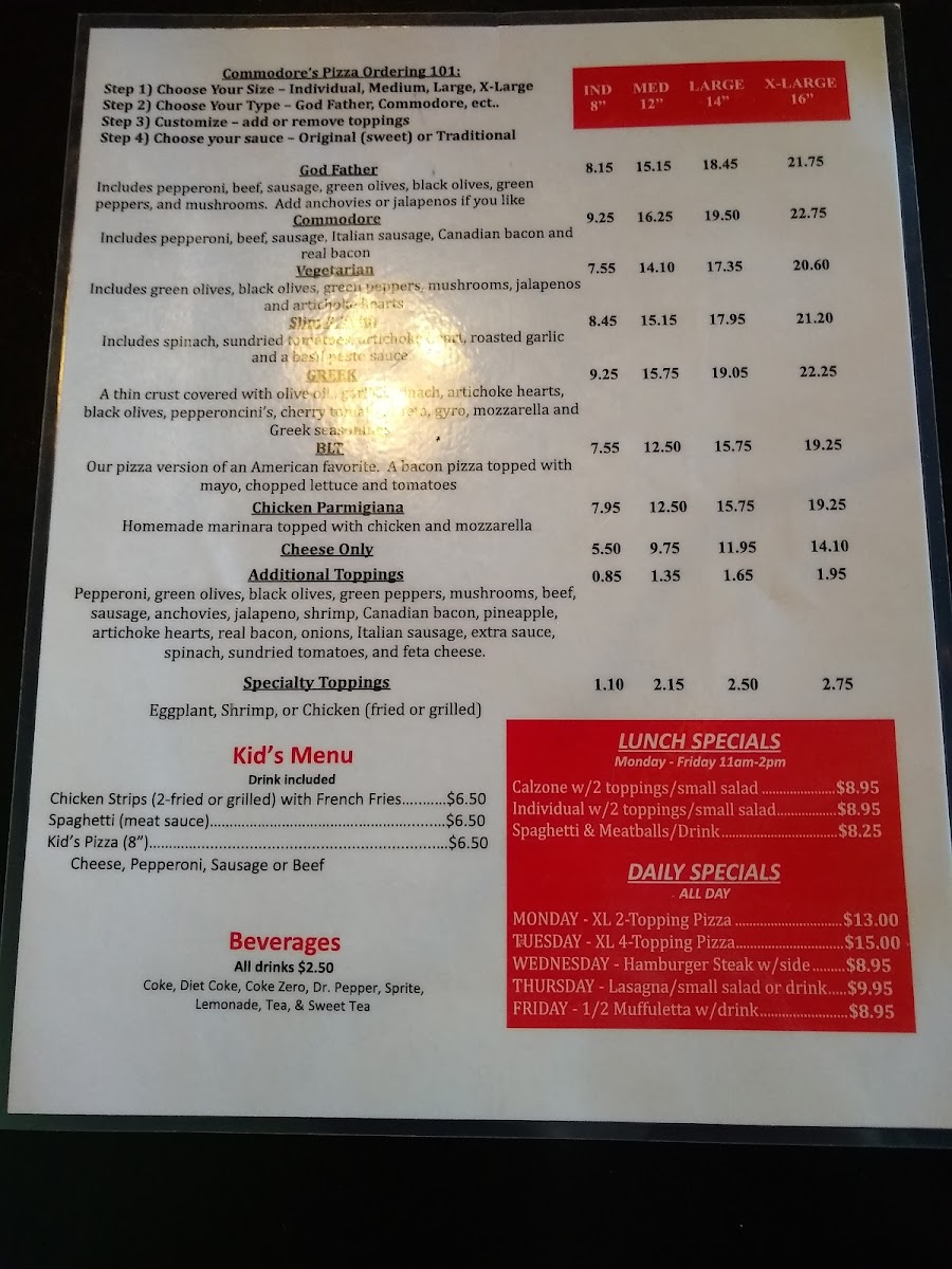 In addition, be sure to complement your meal with their selection of beverages ranging from sweet tea to soda. With glowing testimonials and a knack for comfort food, Commodore's Pizza is destined to become your new favorite pizza spot!